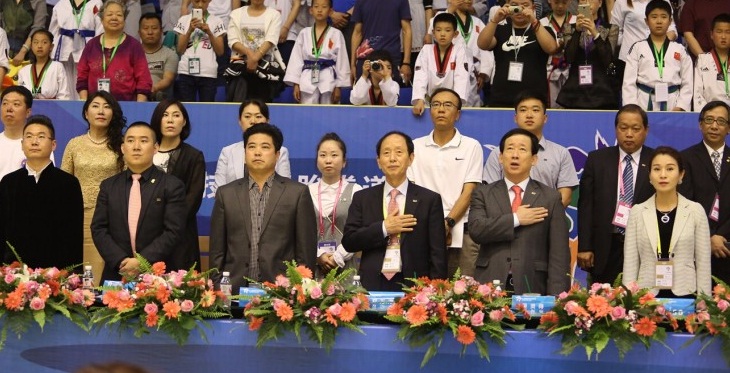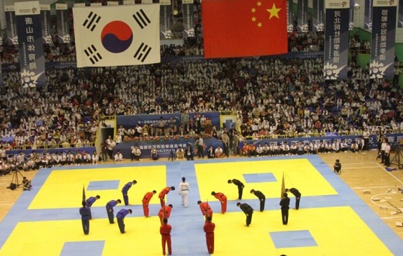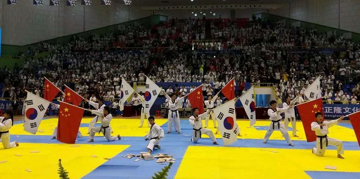 在开幕式上,来自世界咏春拳联盟的表演成员表演了刚柔并济的咏春拳,先后在120多个国家巡回演出的韩国国技院示范团进行了精彩绝伦的跆拳道高难度技巧展示。
